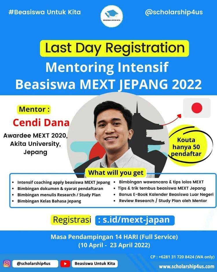 Dalam program bimbingannya untuk beasiswa tertentu akan diberikan full service selama kurang lebih dua minggu, seperti : bimbingan untuk persiapan dan persyaratan dokumen pendaftaran, bimbingan wawancara, bimbingan bahasa Jepang sampai dengan si mentor akan me-review study plan kamu dan lain-lain.